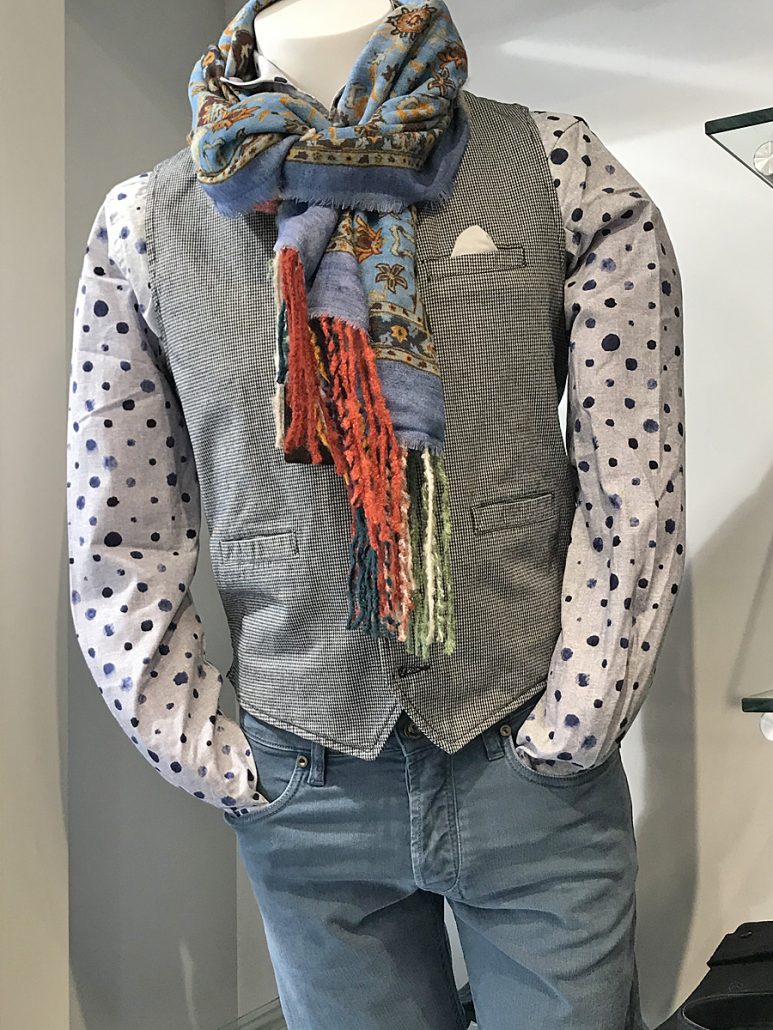 Echarpe 100% laine « Altea » 160€ Chemise 100% coton « R2 » 90€ Gilet « TZ » 120€ Jean coton stretch « Siviglia » 175€